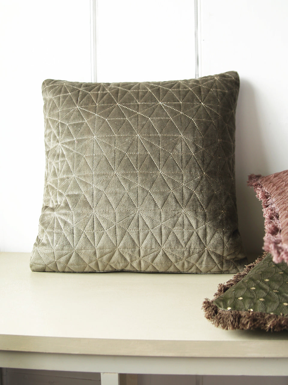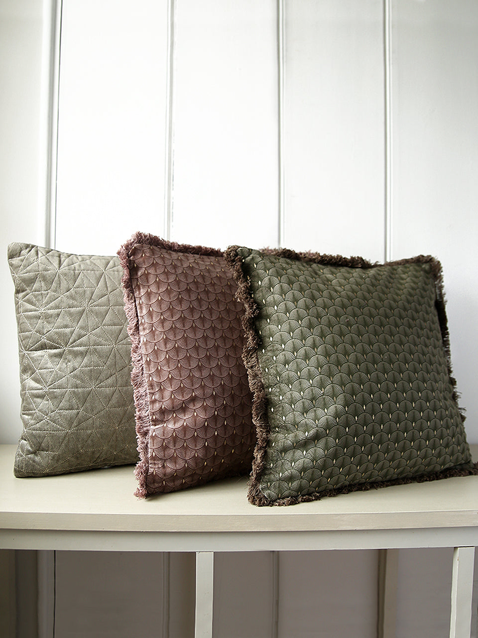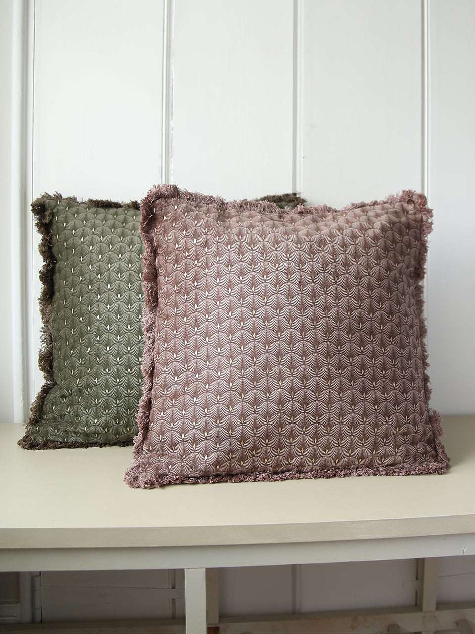 Wonderfully soft, cotton cushion collection in two designs. Simple embroidered elegance in a pale fern shade and repeated fan pattern with gold detail in dusky rose and juniper green with fringe.