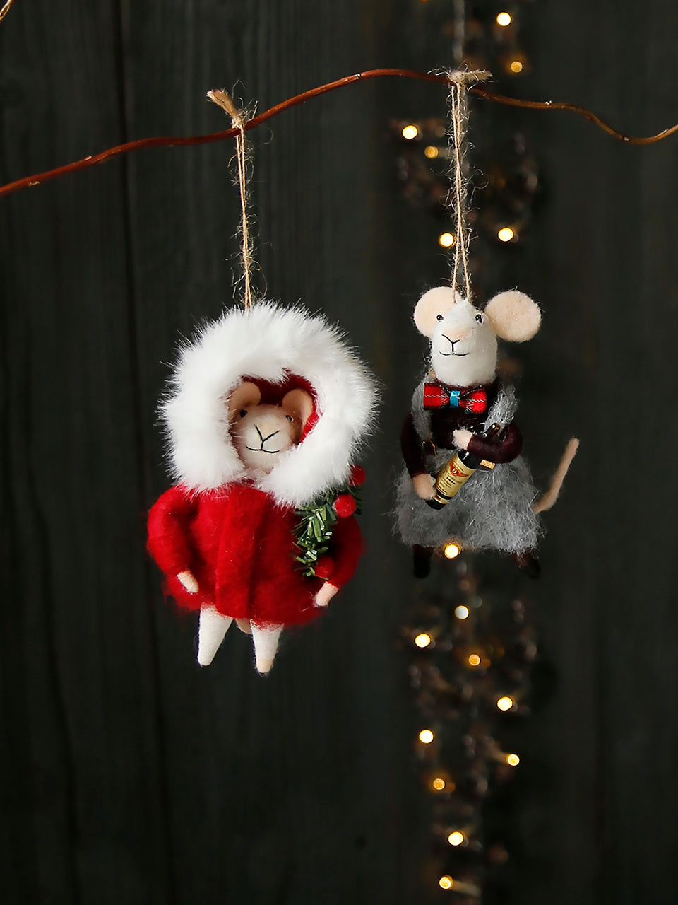 Handmade Christmas mice wrapped up warm bearing gifts of wine, flowers or a wreath. Ready to be displayed on the Christmas tree and sure to be enjoyed every festive season.