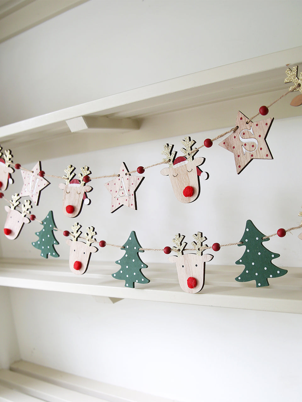 Decorate the home with this charming garland of wooden reindeers with red pom pom noses and golden antlers. Christmas trees punctuated with red beads between each reindeer makes an eye-catching decoration and lovely to display along a mantle or shelf in a child's room leading up to the big day.