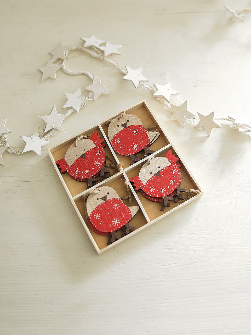 Presented in a sealed wooden tray with 8 robin decorations included. Small parts not suitable for children under 3 years.