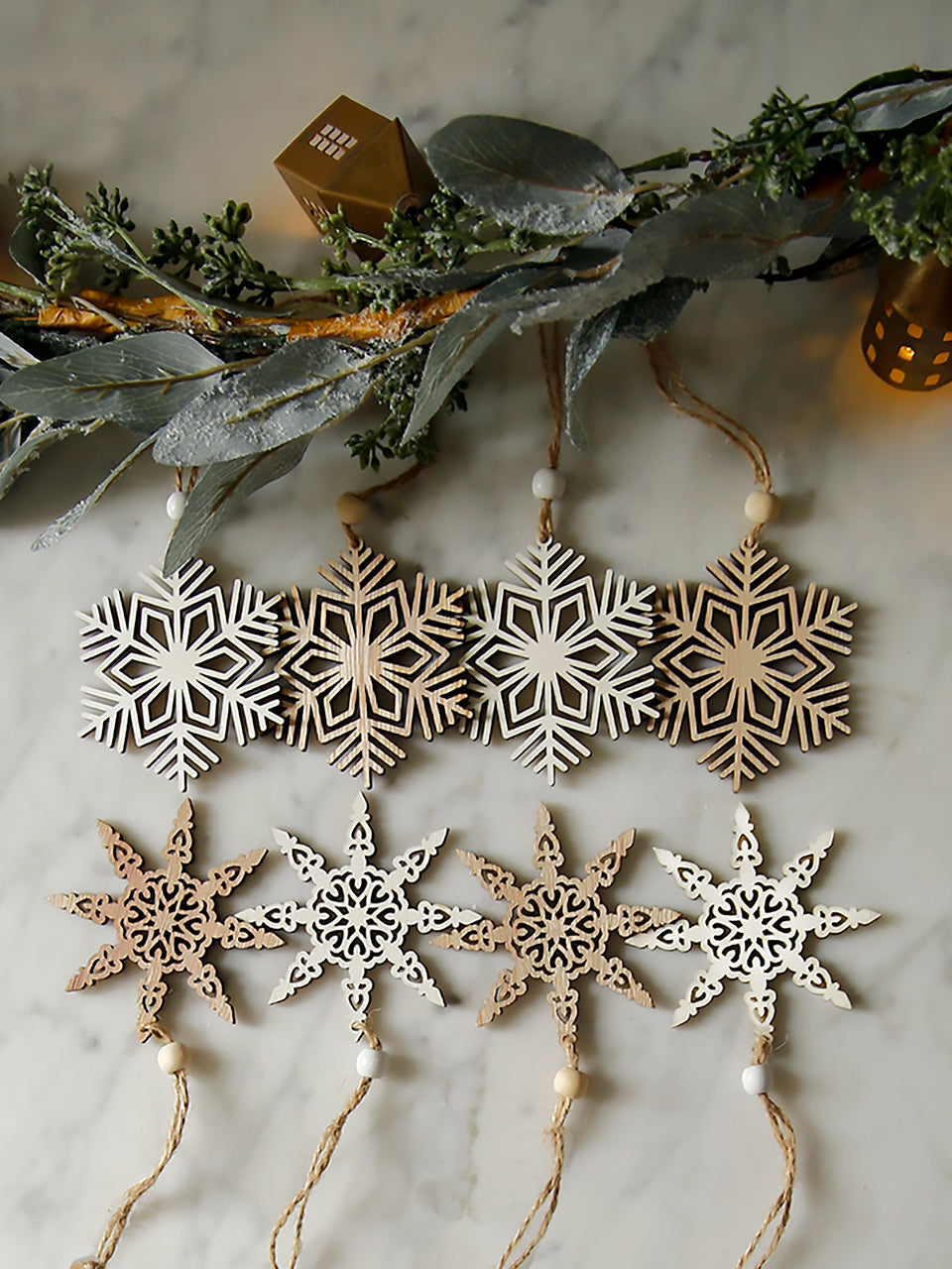 Beautifully crafted mix of natural and white wooden snowflakes to decorate garlands or trees.